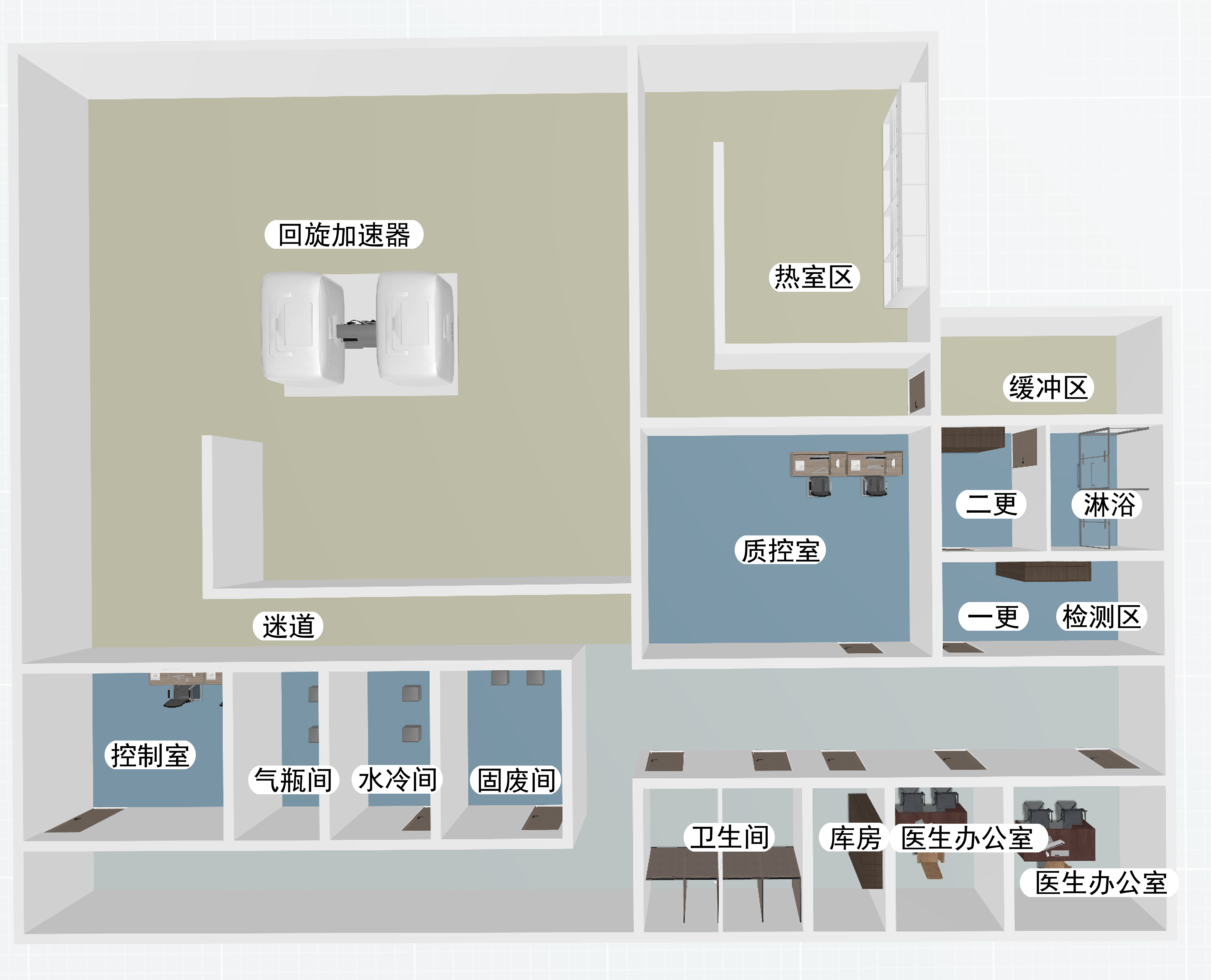 回旋加速器是用于生产正电子药物的设备,是基于高能质子轰击靶材料产生特定放射性核素的过程。设备运行过程,机房内部伴随产生中子及伽马射线,并在药物的合成及分装过程中,药物放射性活度高,具有较高的辐射安全要求。该领域需要环境辐射监测,人员手足污染检测,放射药物活度测量等技术需求。